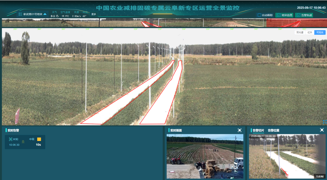 在零碳农业领域,研发团队对系统进行了针对性的升级调整。其一,节能方面,全景光电设备可采用太阳能等清洁能源,降低能耗,减少碳排放;其二,融合层面,设备能将全景图、预警数据,以及收集到的气温、土壤等数据提供给零碳农业管理平台,为零碳农业生产提供数据支撑;其三,共享维度,未来公海jcjc设备会把收集的所有数据同步传输给阜新市大数据局,为整个阜新市的农业决策提供数据支持。